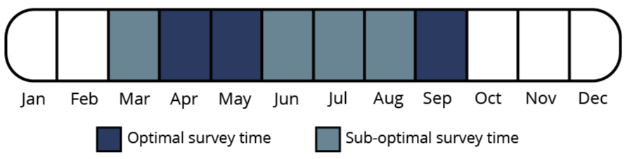 This search can be undertaken as part of a Phase I survey, or separately at any time of the year. However, nesting surveys (to determine if it is an active nest) can only be undertaken during the nesting season, considered to be March to June. Wintering surveys can also be undertaken during November to February.